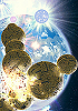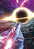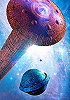 Pfeilraumschiff fliegt in Richtung leuchtende Kugel