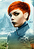 stark geschminkte Frau mit kurzem roten Haar, dahinter transparenter Würfel