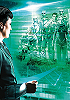 Mann blickt auf schemenhaft sichtbare Gruppe von Menschen und Außerirdischen