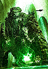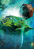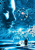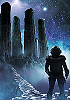 Mann blickt auf riesiges Gesicht, das aus technischer Struktur herausschaut |