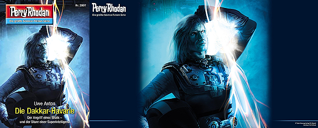 Atlan greift mit einer Hand zum Kopf und hat in der anderen den Raumhelm |