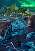 wurmartige Wesen vor Gebäudekomplex und Polarlicht im Hintergrund |