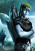 Frau mit spitzen Ohren, grünem Haar und einem rucksackartigem Auswuchs am Rücken |