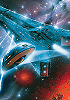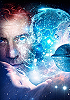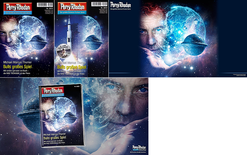 Männergesicht, Saturn-V-Rakete, Kugelraumschiff und Energieblase |