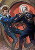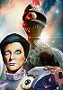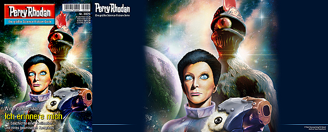 Frau mit hypnotisch blickenden Augen ohne Pupille, weißgefiederter Außerirdischer und zweiter Außerirdi- scher mit Zyklopenauge |