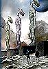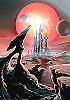 felsige Landschaft vor Türmen unter blutroter Sonne