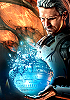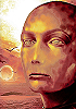 kahlköpfiger Mann mit goldener Haut und ernstem Blick