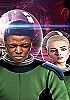 Frau mit wehendem Mantel, dahinter ein transparenter Kubus, in dem ein Außerirdischer eingeschlossen ist