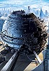 halb abgewracktes Kugelraumschiff am Boden zwischen Gebäuden
