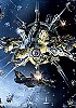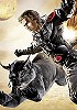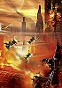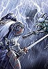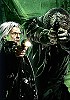 Schwertkämpfer und Insektenwesen mit Schusswaffe stehen einander gegenüber