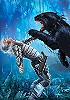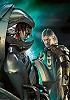 Mann betrachtet anderen Mann, der in einem Raumanzug steckt, der ähnlich wie ein Federkleid eines Vogels aussieht, aber mit Schläuchen statt mit Federn