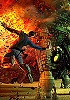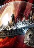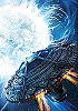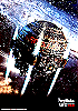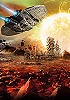 Raumboot fliegt über Höllenplanet, im Hintergrund riesige Sonne mit Protuberanzen
