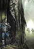 Perry Rhodan versteckt sich im Wald vor Verfolgern hinter Baum