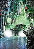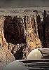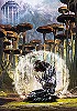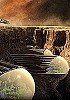 Raumboot über Felsschlucht, in der kugelförmige Stationen angeflanscht sind |