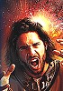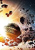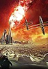 Raumboote drehen vor spitzen Türmen in Steinwüste ab, im Hintergrund ist ein Brand zu sehen |