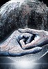 zwei Hände umklammern einander, dahinter transparente Kugel
