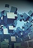Mensch vor kugelförmigen auseinanderdriftenden Würfeln und Quadern