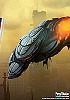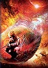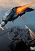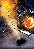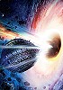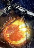 Kugelraumschiff vor Energiestrudel, in den Felsbrocken hineinstürzen