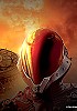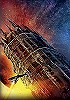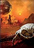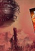 Skelettkopf eines Außerirdischen über Ruinenstadt, über der ein Kugelraumschiff schwebt