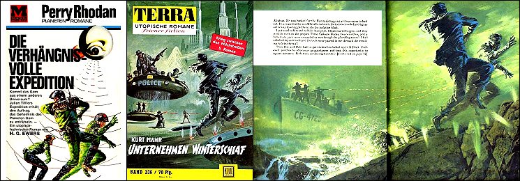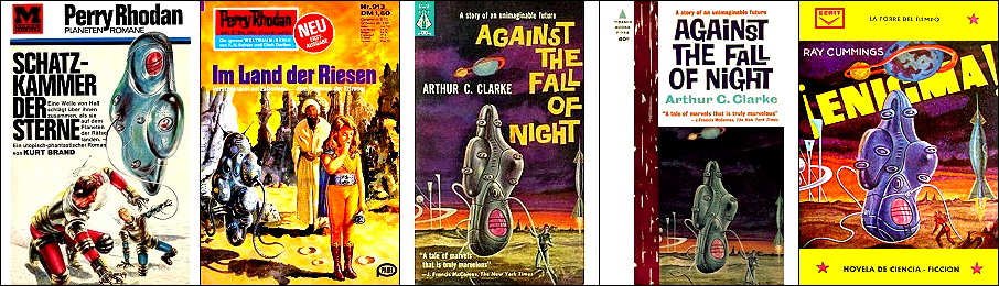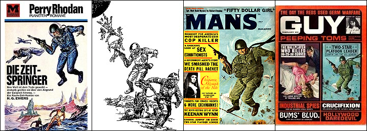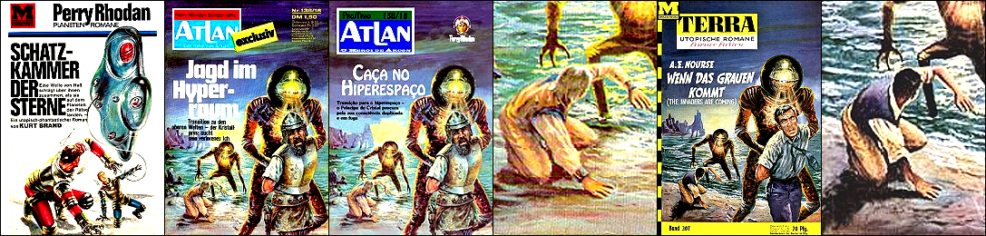 ähnliches Motiv, 1 - 4 gleiches Bild, in 2 Raumfahrer und Hintergrund überarbeitet, in 4 nur Hintergrund überarbeitet, 5 - 6 gleiches Bild, möglicherweise Inspiration für 1 |