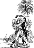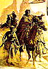 mit letzter Kraft kriechender Mann, dahinter ein Beduine, der auf einem Pferd reitet und mit dem Arm zur Seite deutet, und zwei zu Fuß gehende Begleiter |