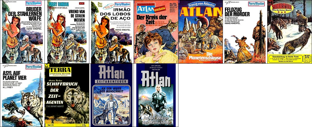1 - 3 gleiches Bild; ähnliche Motive: 1 - 4 Wolf, der die Zunge seitlich heraushängen lässt, 1 - 3 und 5 Mann, der einen Wolf umarmt, 5 - 7 Wolf, der aggressiv nach vorn schaut, 8 - 9 Wolf mit heraushängender Zunge, der zum Betrachter schaut, ähnlich wie in 1, 10 Neuinterpretation von 1 für HC-Ausgabe, 11 für eBook-Ausgabe |
