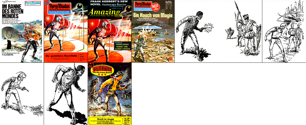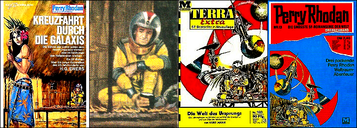 Raumfahrer in 1 von 2 nachgezeichnet, 2 und 3 gleiches Bild, 4 ist Hommage an Bruck und wahrscheinlich von 1 nachgezeichnet |