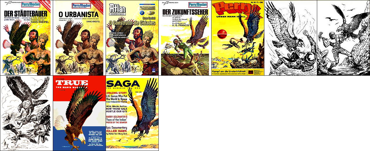 ähnliche Motive, 1 - 3 gleiches Bild, 3 mit überarbeitetem Hintergrund, 9 wahrscheinlich Vorbild für den Raubvogel in 1 - 3, 10 für 4