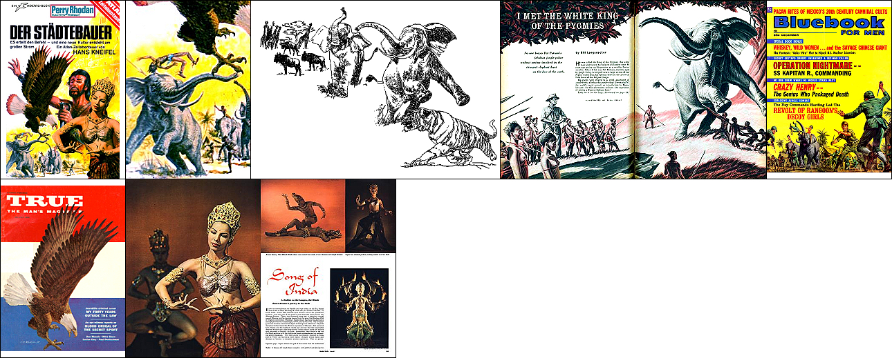 der linke Elefant kommt auch in 3 vor und ist von 4 seitenverkehrt nachgezeichnet, der zweite Elefant und die Menschengruppe von 5 übernommen, der Adler von 6 und die Frau von 7 übernommen