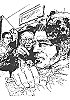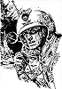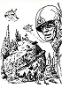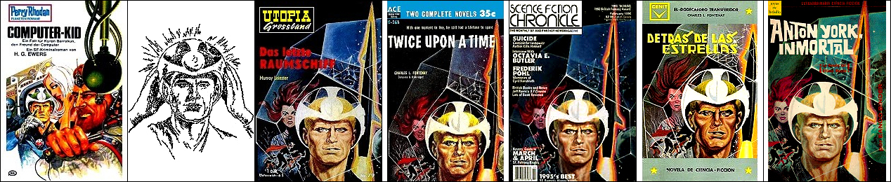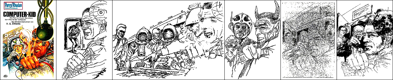 sehr ähnliches Motiv, in 2 und 3 fehlt der hintere Mann, in 4 schaut der linke Mann nur zum anderen, der ein Außerirdischer mit Hörnern ist, zeigt nicht mit dem Finger auf ihn, hat aber einen ähnlichen Helm wie in 1, in 5 und 6 zeigt er wie in 1 mit dem Finger, 6 ist das Vorbild für Nachzeichnungen |