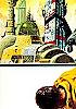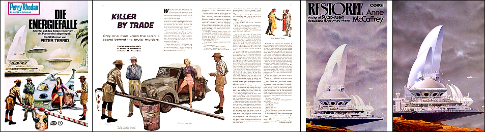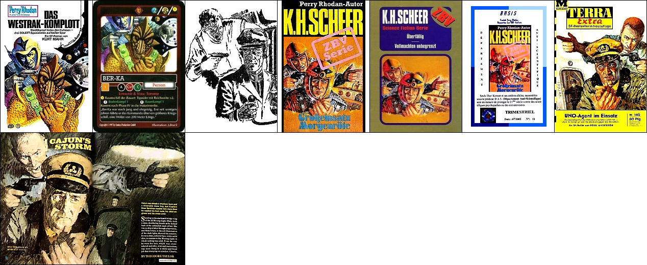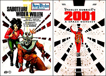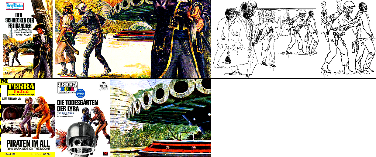 Die Hintergrundszene in 1 findet sich in 3 seitenverkehrt wieder, in 6 sind die beiden Raumfahrer aus 1 als Collage eingebaut, das Gebäude in 1 ist von 7 nachgezeichnet |