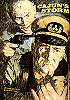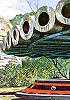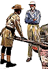Mann ist von Baum verdeckt, dahinter hält ein Mann dem anderen die Pistole an den Rücken, im Hinter-grund ein Gebäude mit ausladendem Dach, das wie aus Röhren zusammengesetzt aussieht, siehe auch