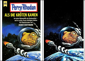 Krötenwesen und schraubenzieherförmiges Raumschiff