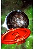 ausgehöhlter Mond mit Pyramiden und Kugelraumschiff