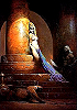 Prinzessin mit langer Schleppe, an Säule gelehnt |