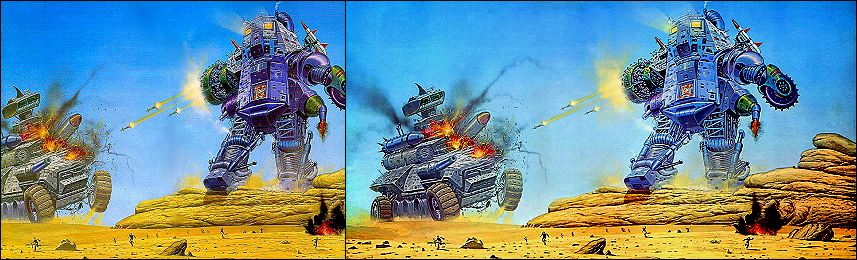 Riesenroboter und Kampfpanzer im Gefecht gegeneinander