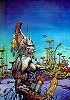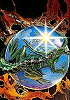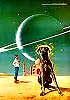 Gesicht von bärtigem Mann, darüber Felslandschaft mit Saturn