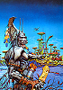 blauhäutiger Mann mit Federschmuck und Fühlern auf dem Kopf vor riesigen Pilzbäumen