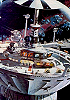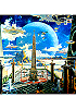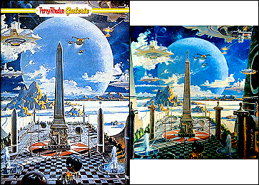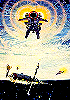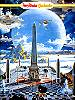 Obelisk, Raumschiff und dahinter Riesenplanet am Himmel