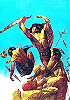 zwei Pferde mit einem menschlichen und einem außerirdischen Reiter scheuen vor Gerippen