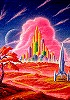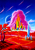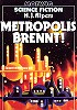 brennende Weltraumstadt mit Türmen und Kuppeln