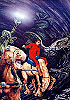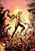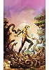 nackter Mann mit Kristallkugel wird von Schlangen bedroht