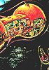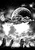 Raumboot über fremdartigen Gewächsen, am Himmel großer Mond