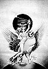 Frau reitet auf Vogel, dahinter Auge