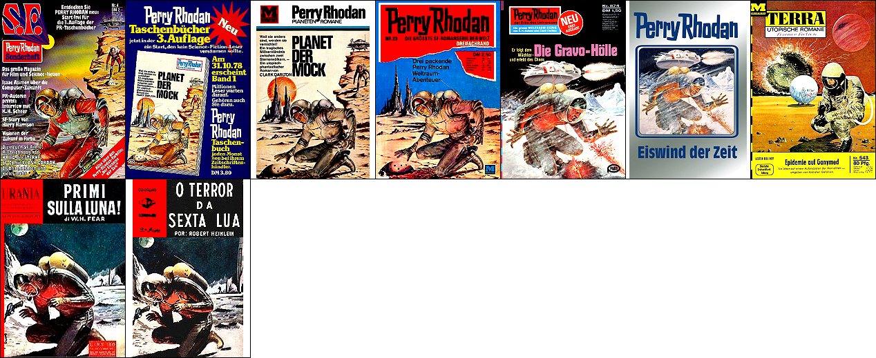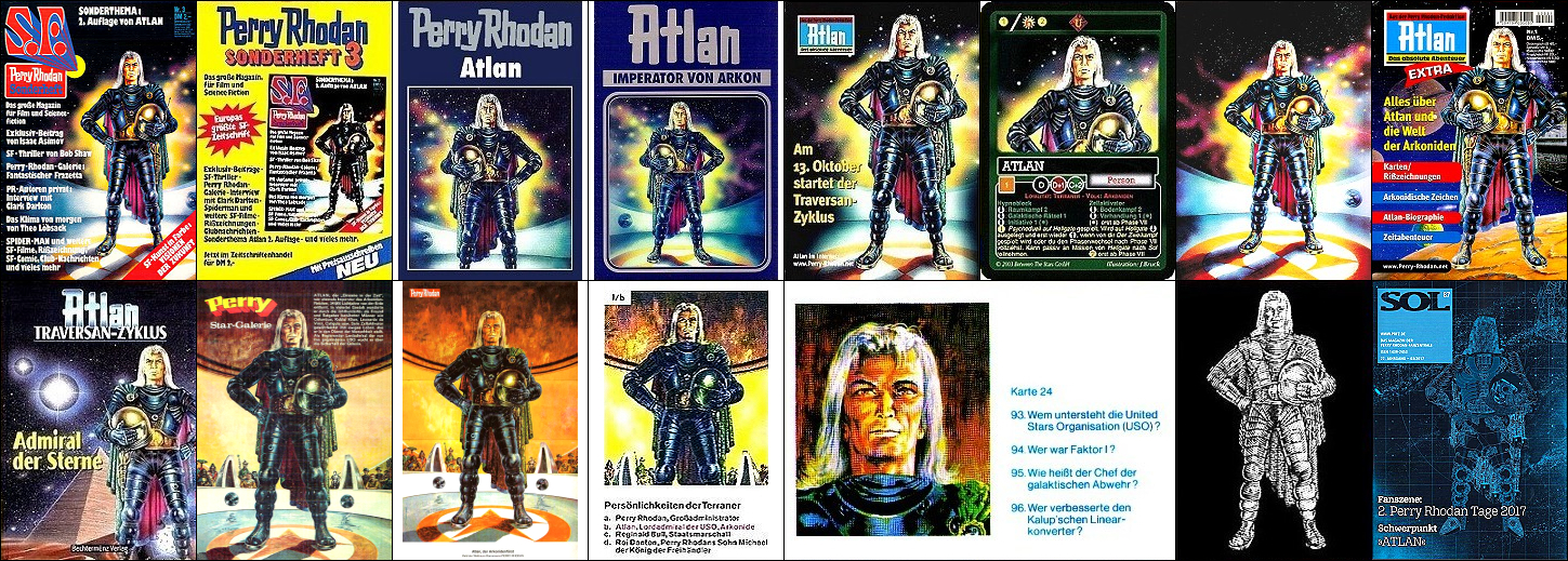 1 - 7 gleiches Bild, 5 - 6 seitenverkehrt, 8 - 9 mit anderem Hintergrund, 1 - 9 verwenden das Bild von 10 bzw. 11 mit verändertem Hintergurnd, 10 - 13 gleiches Bild, 13 nur vergrößerter Kopfausschnitt, 14 Vignette für Romaninnenseite, 15 Atlan-Motiv als Schemazeichnung |
