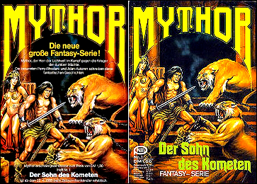 Mythor mit Schwert verteidigt Prinzessin gegen Säbelzahntiger