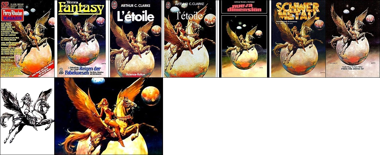 Reiterin auf Pegasus vor Planetenkugel, siehe auch PR Taschenbuch Nr. 130 und Moewig SF Taschenbuch Nr. 3662