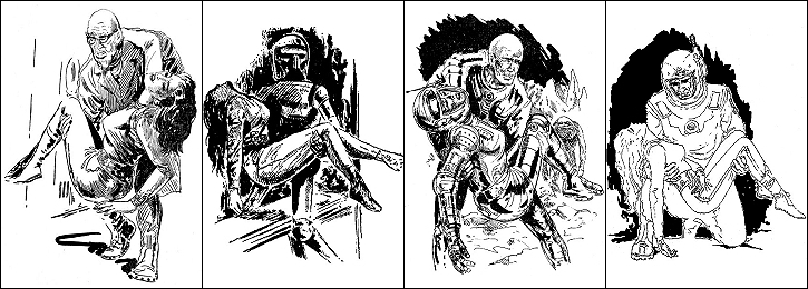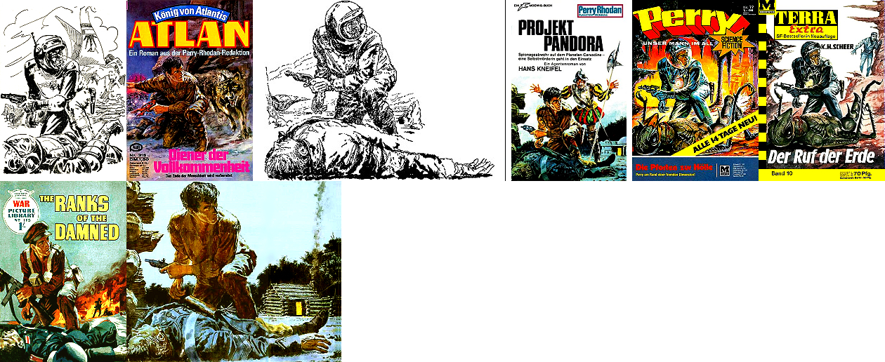 gleiche Körperhaltung 2 nur kniender Mann, 5 und 6 gleiches Bild mit überarbeitetem Hintergrund, alle Nachzeichnung von 8 |