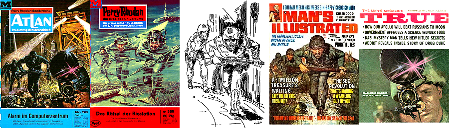 sehr ähnliches Motiv, 1 und 2 gleiches Bild mit überarbeitetem Hintergrund, die Männer wurden mit transparenten Helmen ergänzt, 4 Vorbild für Nachzeichnungen |