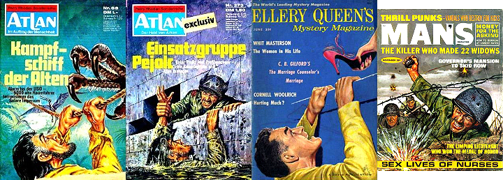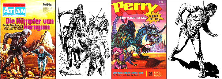 1 - 3 von 4 inspiriert bzw. nachgezeichnet, 7 von 8 nachgezeichnet, 9 - 11 gleiches Bild, für die italienischen PR-Ausgaben leicht bearbeitet, 11 seitenverkehrt, 12 - 14 gleiches Bild, 15 sehr ähnlich, 19 und 20 gleiches Bild, 20 Ausschnitt, 21 Neuinterpretation von 22 für deutsche Ausgabe |